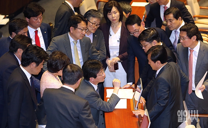 6일, 서울 여의도 국회 본회의장에서 열린 본회의 직전, 박상옥 대법관 후보자에 대한 임명동의안 상정과 관련해 유승민 원내대표 쪽에 모여 들어 있다.