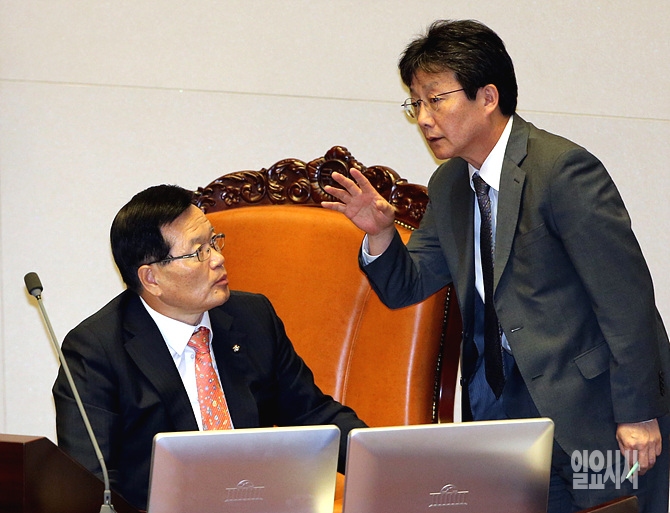 6일, 서울 여의도 국회 본회의장에서 열린 본회의 도중 정의화 의장이 새누리당 유승민 원내대표와 박상옥 대법관 후보자 임명동의안 상정과 관련해 이야기를 나누고 있다.