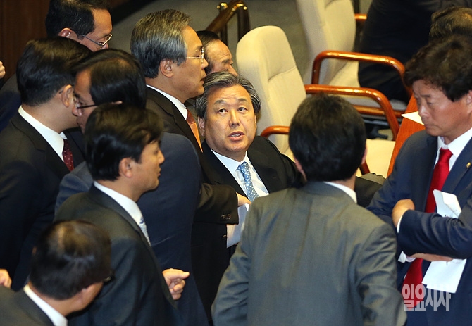 6일 서울 여의도 국회 본회의장 안에서 '박상옥 대법관 후보자 임명동의안'과 관련해 새누리당 김무성 대표(사진 가운데)와 새정치민주연합 우윤근 원내대표가 잠시 이야기를 나누고 있다.