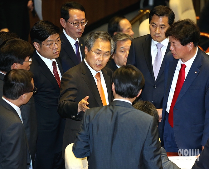 6일 서울 여의도 국회 본회의장 안에서 '박상옥 대법관 후보자 임명동의안'과 관련해 새누리당 유승민 원내대표(사진 가운데)와 새정치민주연합 우윤근 원내대표가 심각한 표정으로 이야기를 나누고 있다.
