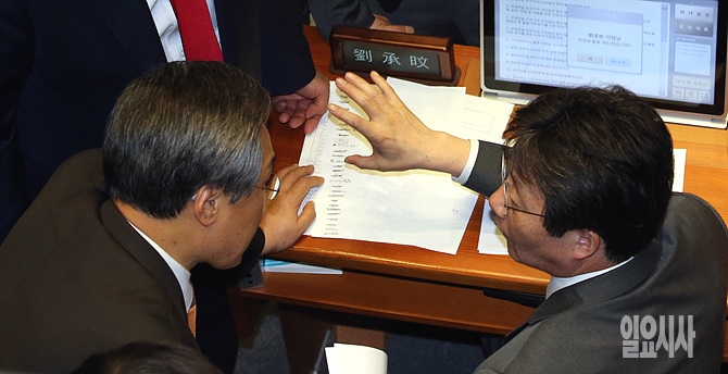 6일 서울 여의도 국회 본회의장 안에서 '박상옥 대법관 후보자 임명동의안'과 관련해 새누리당 유승민 원내대표(사진 오른쪽)와 새정치민주연합 우윤근 원내대표가 이야기를 나누고 있다.