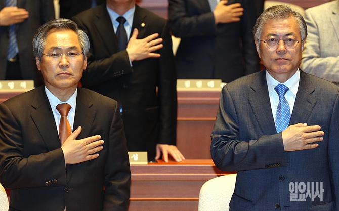 6일, 서울 여의도 국회에서 새정치민주연합 의원총회가 열린 가운데 문재인 대표(사진 오른쪽)-우윤근 원내대표가 국기에 대한 경례를 하고 있다.