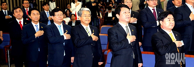 7일, 서울 여의도 국회 본청에서 새정치민주연합 원내대표 선출을 위한 의원총회가 열린 가운데, (사진 오른쪽 두 번째부터) 최재성·김동철·설훈·조정식·이종걸 5인의 후보자들이 국기에 대한 경례를 하고 있다.