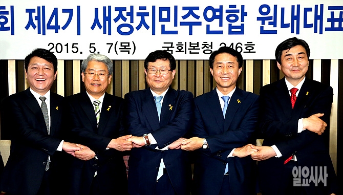 7일, 서울 여의도 국회 본청에서 새정치민주연합 원내대표 선출을 위한 의원총회가 열린 가운데, 최재성·김동철·설훈·조정식·이종걸 5인의 후보자들이 서로 손을 맞잡고 있다.