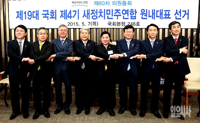 7일, 서울 여의도 국회 본청에서 새정치민주연합 원내대표 선출을 위한 의원총회가 열린 가운데, 문재인 대표(사진 왼쪽서 세 번째)를 비롯해 우윤근 원내대표(사진 왼쪽서 두 번째), 최재성·김동철·설훈·조정식·이종걸 5인의 후보자들이 서로 손을 맞잡고 있다.