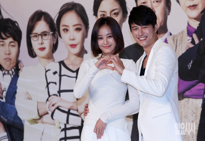 배우 재희, 강별이 7일 오후 서울 영등포 타임스퀘어 아모리스홀에서 열린 KBS1 새 일일드라마 <가족을 지켜라> 제작발표회에서 포즈를 취하고 있다.