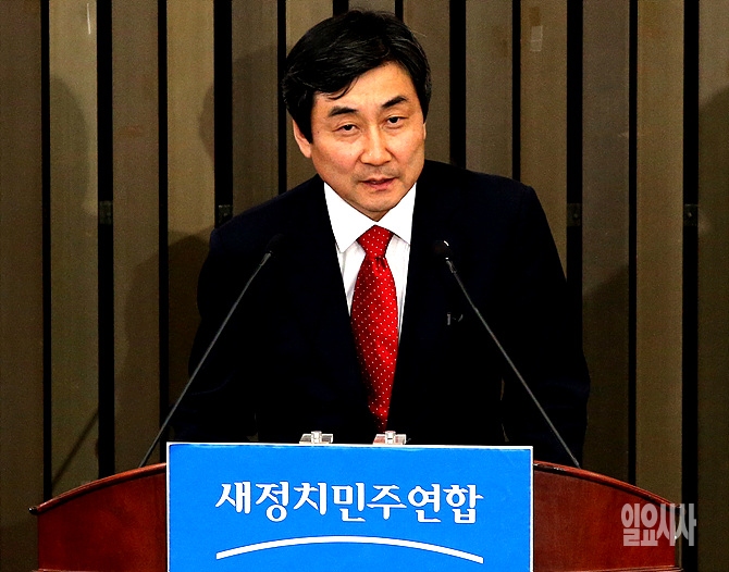 7일, 서울 여의도 국회 본청에서 열린 새정치민주연합 원내대표 선출을 위한 의원총회에서 당선된 4선 이종걸 의원이 수락연설을 하고 있다.
