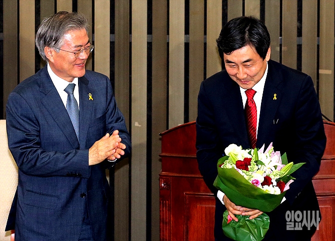 7일, 서울 여의도 국회 본청에서 열린 새정치민주연합 원내대표 선출을 위한 의원총회에서 문재인 대표가 박수로 이종걸 원내대표 당선자를 축하해주고 있다.