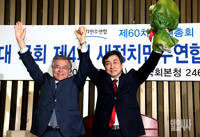 7일, 서울 여의도 국회 본청에서 열린 새정치민주연합 원내대표 경선 직후, 문재인 대표와 이종걸 신임 원내대표가 꽃다발을 들고 환호하고 있다.