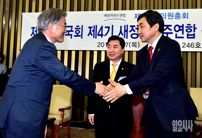 7일, 서울 여의도 국회 본청에서 열린 새정치민주연합 원내대표 경선 직후, 문재인 대표와 이종걸 신임 원내대표가 악수를 나누고 있다.
