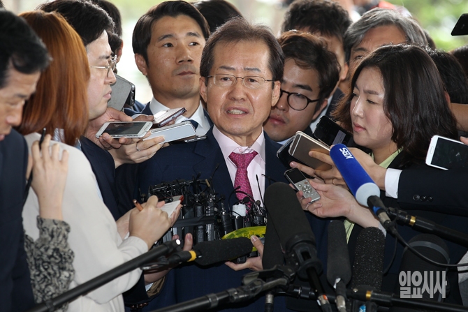 성완종리스트에 이름이 오른 홍준표 경남지사가 8일 오전 피의자 신분으로 서초동 서울고등검찰청에 출석해 취재진의 질문에 답하고 있다.