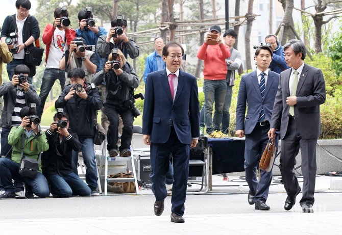 성완종리스트에 이름이 오른 홍준표 경남지사가 피의자 신분으로 조사를 받기 위해 8일 오전 서초동 서울고등검찰청에 출석하고 있다.
