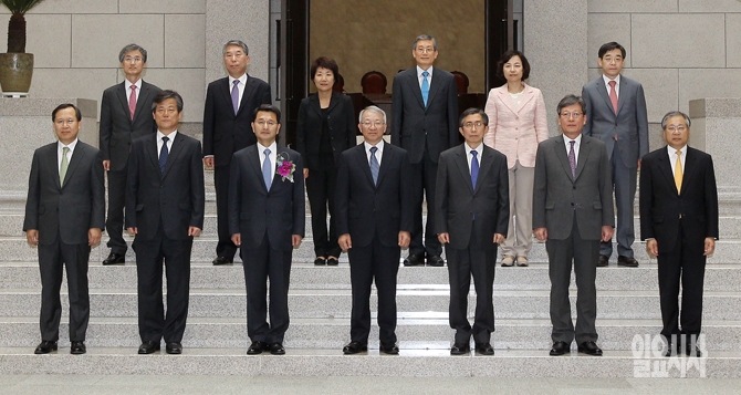 8일 오후 서울 서초동 대법원에서 열린 박상옥 신임 대법관 취임식에서 양승태 대법원장(앞줄 왼쪽 네 번째)과 박 대법관(앞줄 왼쪽 세 번째) 등 대법관들이 기념촬영을 하고 있다.