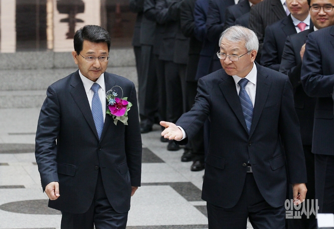 박상옥 신임 대법관(왼쪽)과 양승태 대법원장이 8일 오후 서울 서초동 대법원에서 열린 대법관 취임식에 입장하고 있다.