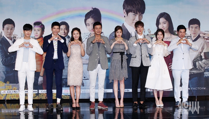 8일 오후 서울 마포구 상암동 MBC 신사옥에서 열린 미니시리즈 <맨도롱 또똣> 제작발표회에서 출연진이 포즈를 취하고 있다. 왼쪽부터 배우 진영, 김성오, 김희정, 이성재, 강소라, 유연석, 서이안, 이한위.