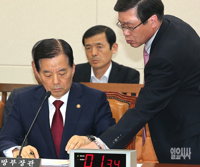 11일, 서울 여의도 국회 국방위원회 회의실에서 열린 국방위 긴급 전체회의 도중, 국방부 한 관계자가 한민구 국방부장관에게 보고를 하고 있다.