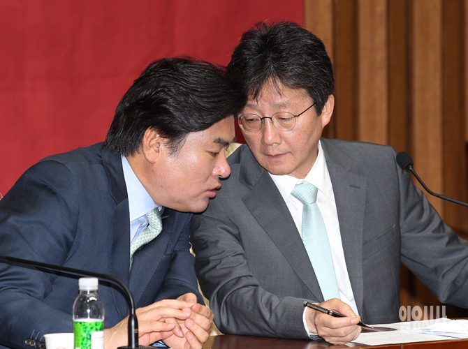 새누리당 유승민 원내대표(오른쪽)와 원유철 정책위의장이 12일 오전 서울 여의도 국회에서 열린 원내대책회의에서 대화하고 있다.
