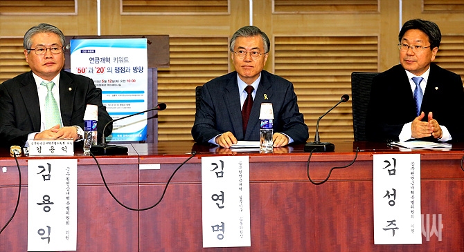 12일, 서울 여의도 국회 의원회관 제1세미나실에서 열린 '현금개혁 키워드 '50'과 '20'의 쟁점과 방향 긴급 토론회에 새정치민주연합 문재인 대표-강기정 정책위의장-김용익 의원이 참석해 있다.