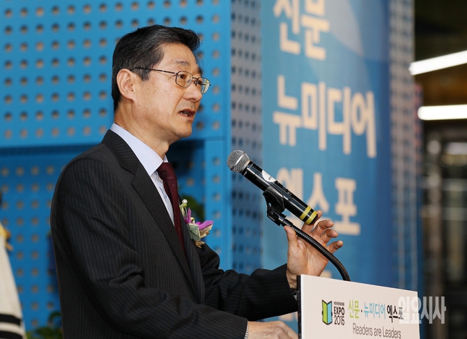 송필호 한국신문협회 회장이 12일 오전 서울시청 시민청에서 열린 '2015 신문·뉴미디어 엑스포' 개막식에서 개회사를 하고 있다.