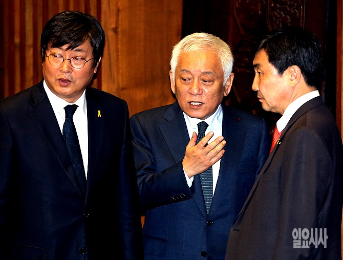 12일, 서울 여의도 국회 본회의장에서 열린 본회의 직전, 김한길 새정치민주연합 전 공동대표와 이종걸 원내대표가 잠시 이야기를 나누고 있다.