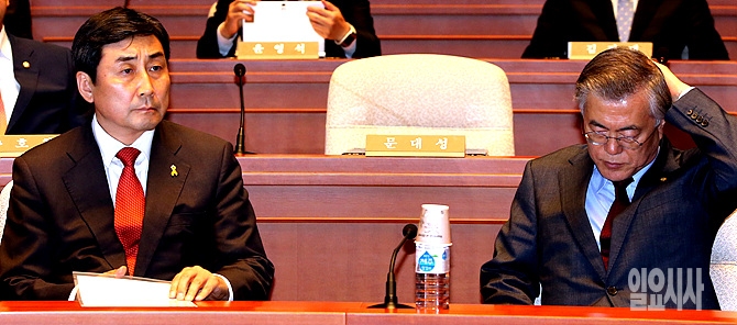 12일 서울 여의도 국회에서 열린 의원총회 도중 새정치민주연합 문재인 대표(사진 오른쪽)와 이종걸 원내대표가 잠시 심각한 표정을 짓고 있다.