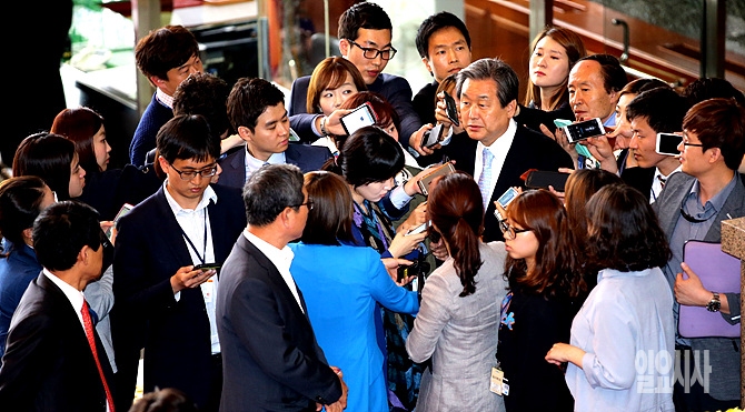 12일 서울 여의도 국회에서 새누리당 김무성 대표가 취재진에 둘러싸여 있다.