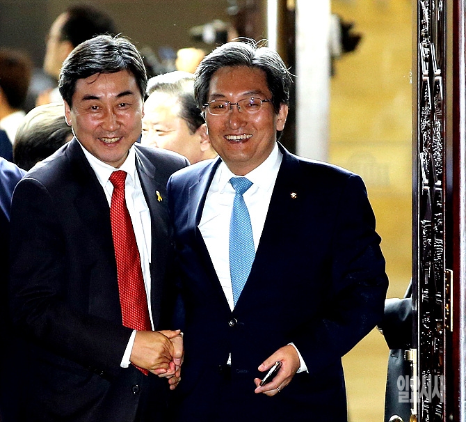 12일 서울 여의도 국회에서 열린 새정치민주연합 의원총회에서 새정치민주연합 이종걸 원내대표(사진 왼쪽)과 노영민 의원이 악수를 나누고 있다.