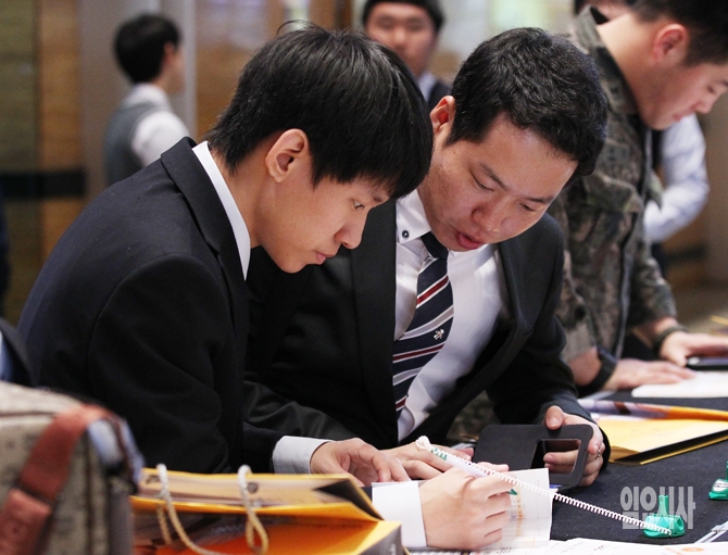 13일 오전 서울 삼성동 코엑스에서 열린 ′2015 KB굿잡 우수기업 취업박람회′에서 관람객들이 입사지원서를 작성하고 있다. 취업교육과 연계한 프로그램 운영 및 단일규모 국내 최대 취업박람회인 ′KB굿잡 취업박람회′는 취업교육, 직업 체험 및 진로 상담부터 실질 채용에 이르기까지 구직 전 과정을 지원한다.