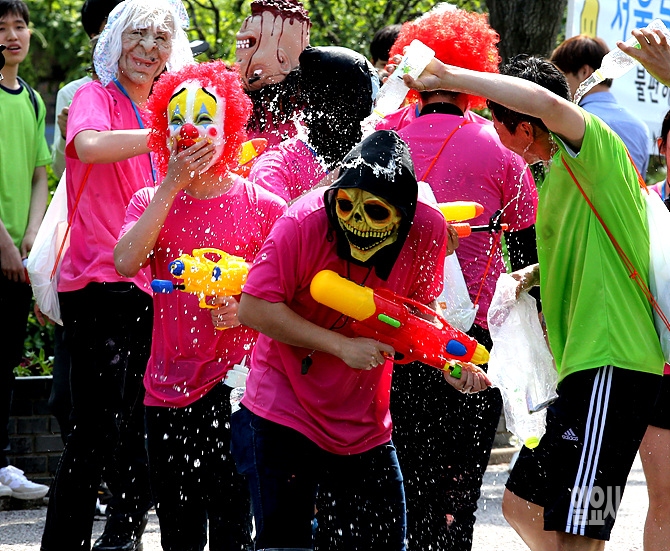 13일 오후, 서울 한때 낮기온이 24도까지 오르며 초여름 날씨를 나타낸 가운데, 서울 종로구 성균관대학교에서 열린 축제에서 학생들이 물놀이 삼매경에 빠져 즐거운 시간을 보내고 있다.