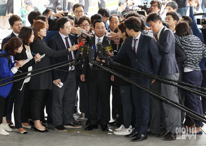 성완종 전 경남기업 회장으로부터 3천만원을 수수한 혐의를 받고 있는 이완구 전 국무총리가 14일 오전 검찰조사를 받기 위해 서초동 서울고등검찰청에 출석, 취재진의 질문에 답하고 있다.