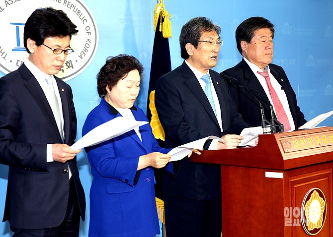 14일, 새정치민주연합 진성준·인재근·노영민·최규성 의원이 서울 여의도 국회 정론관에서 강기훈씨 유서대필 조작사건 무죄판결 기자회견을 갖고 있다.