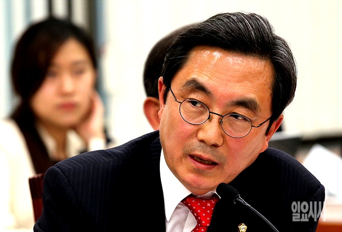 18일, 서울 여의도 국회 농림축산식품해양수산위원회 회의실서 열린 전체회의 도중 새누리당 경대수 의원이 유기준 해양수산부장관에게 질의를 하고 있다.