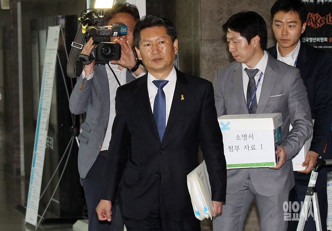 '공갈 막말'로 당내 물의를 빚은 새정치민주연합 정청래 최고위원이 20일 오전 서울 여의도 국회에서 열린 당 윤리심판원 회의에 출석하고 있다.