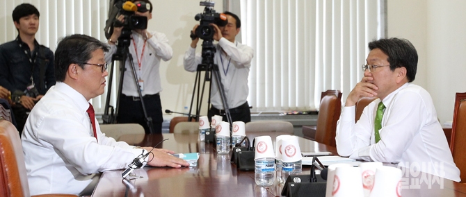 공무원연금개혁특별위원회 여야 간사인 새누리당 조원진 의원(왼쪽)과 새정치민주연합 강기정 의원이 20일 오전 서울 여의도 국회에서 회동을 열고 공무원연금 개혁 및 국민연금 등 공적연금 강화 문제에 대한 해법을 찾기 위해 논의하고 있다.