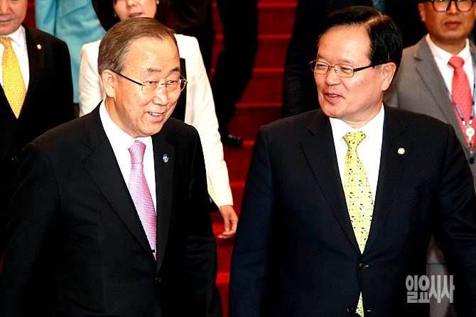 20일, 서울 여의도 국회를 방문한 반기문 유엔 사무총장(사진 왼쪽)이 정의화 국회의장장과 이동 중에 담소를 나누고 있다. (사진공동취재단)