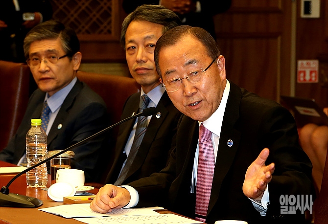 20일, 서울 여의도 국회를 예방한 반기문 유엔 사무총장이 정의화 국회의장 및 여야 원내대표단과의 회동에서 발언하고 있다. (사진공동취재단)