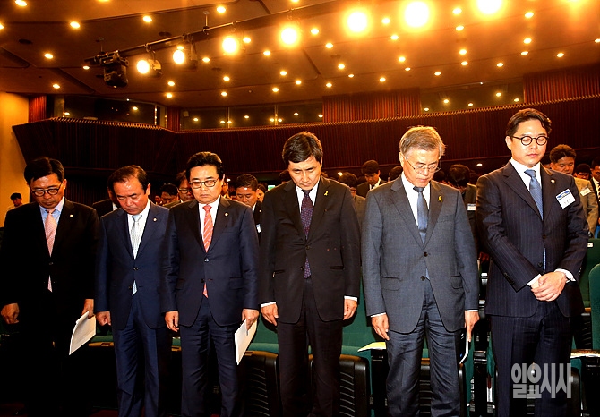 20일, 서울 여의도 국회서 열린 새정치민주연합 전국청년위원회 출범식에서 문재인 대표-이종걸 원내대표 등이 잠시 묵념을 하고 있다.