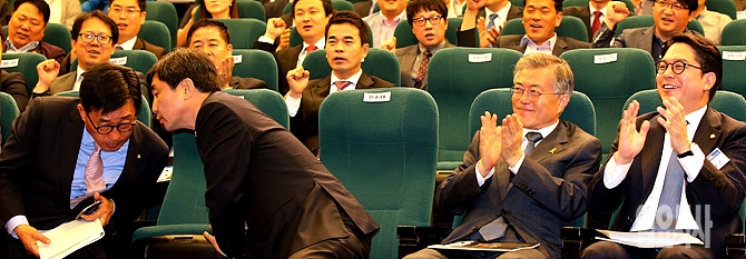 20일, 서울 여의도 국회서 열린 새정치민주연합 전국청년위원회 출범식 도중 이종걸 원내대표가 김춘진 의원과 귓속말을 나누고 있다.