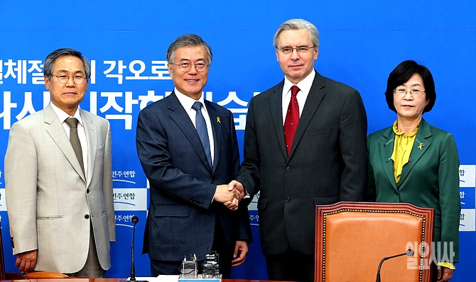 20일, 서울 여의도 국회 새정치민주연합 대표실에서 문재인 대표가 알렉산드르 티모닌 주한러시아 대사와 악수를 나누고 있다.