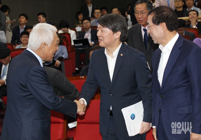 새정치민주연합 안철수(왼쪽부터), 김한길 전 공동대표와 박원순 서울시장이 21일 오전 서울 여의도 국회의원회관에서 열린 '공정시장을 위한 남북경제협력 좌담회'에 참석해 인사를 나누고 있다.