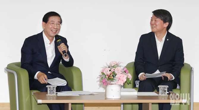 박원순 서울시장(왼쪽)과 새정치민주연합 안철수 전 공동대표가 21일 오전 서울 여의도 국회의원회관에서 열린 '공정시장을 위한 남북경제협력 좌담회'를 열고 토론하고 있다.