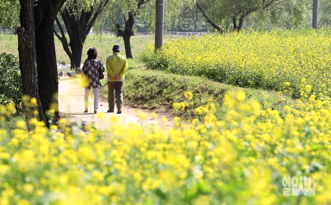 부부의 날이자 절기상 소만을 맞은 21일 오후 서울 서초구 서래섬에 조성된 유채꽃밭에서 시민들이 산책을 즐기고 있다.