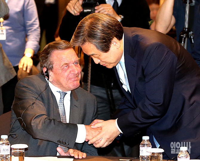 21일, 서울 여의도 전경련회관에서 열린 게르하르트 슈뢰더 독일 전 총리와의 특별 대담 직전 새누리당 김무성 대표가 슈뢰더 전 총리와 악수를 나누고 있다.
