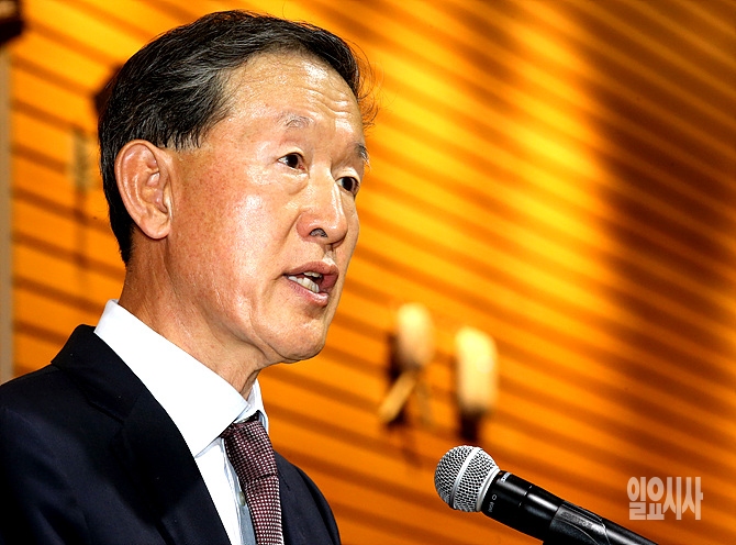 21일, 서울 여의도 전경련회관에서 열린 게르하르트 슈뢰더 전 독일총리 특별대담 직전, 허창수 전경련 회장이 인사말을 하고 있다.