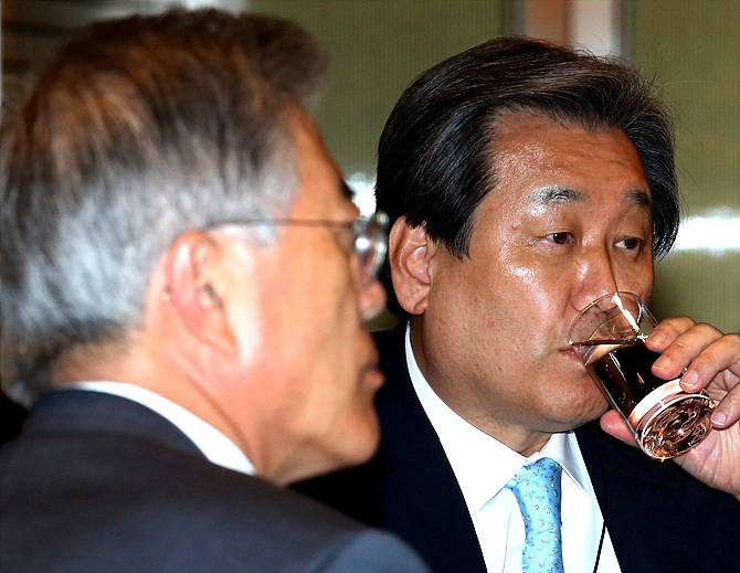 21일, 서울 여의도 전경련회관서 열린 게르하르트 슈뢰더 전 독일총리 특별대담 도중 새누리당 김무성 대표가 목이 타는 듯 물을 들이키고 있다.