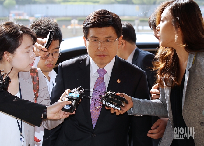 국무총리로 내정된 황교안 법무부 장관이 22일 오전 정부과천청사로 출근해 취재진의 질문을 듣고 있다.