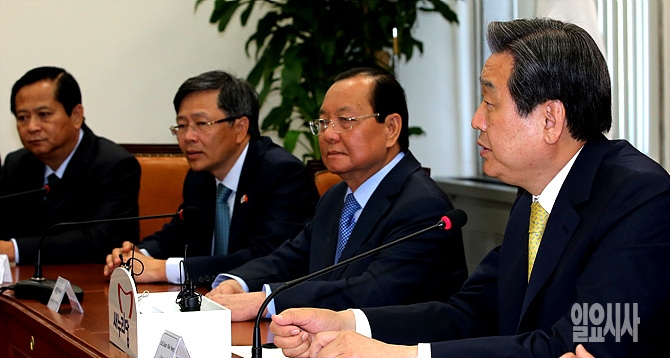 26일, 서울 여의도 국회 새누리당 대표실에서 베트남 레탄하이 호치민 당서기의 새누리당 김무성 대표 예방 도중 김 대표가 발언하고 있다.