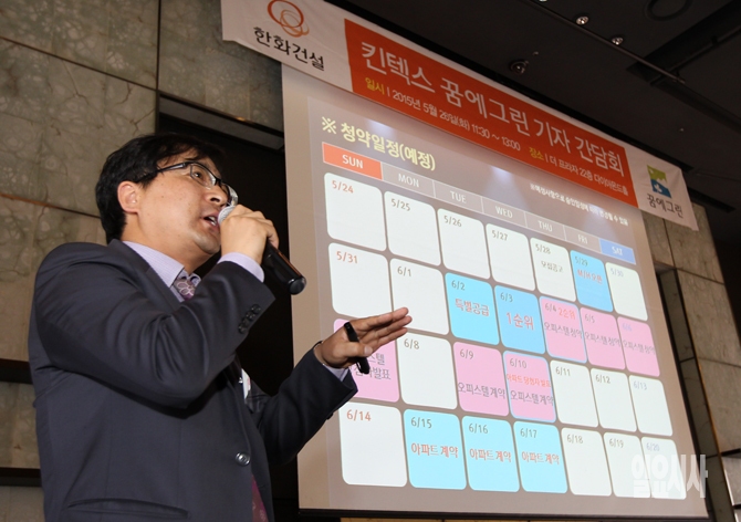 전용운 엠비엔홀딩스 영업본부장이 26일 오전 서울 중구 프라자호텔에서 열린 한화건설 '킨텍스 꿈에그린 기자간담회'에서 취재진의 질문에 답하고 있다. 한화건설은 경기 고양시 일산서구 대화동 킨텍스 1단계 C2블록에 지어질 '킨텍스 꿈에그린’의 모델하우스를 오는 29일 개관하고 분양을 시작한다.