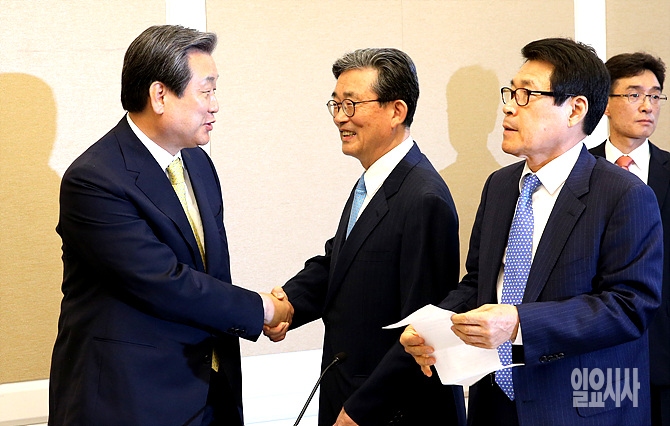 26일, 서울 여의도 여의도 국회 귀빈식당서 열린 제6차 새누리당 전국상임위원회에서 김무성 대표(사진 왼쪽)가 이한구 전 원내대표와 반가움의 악수를 나누고 있다.