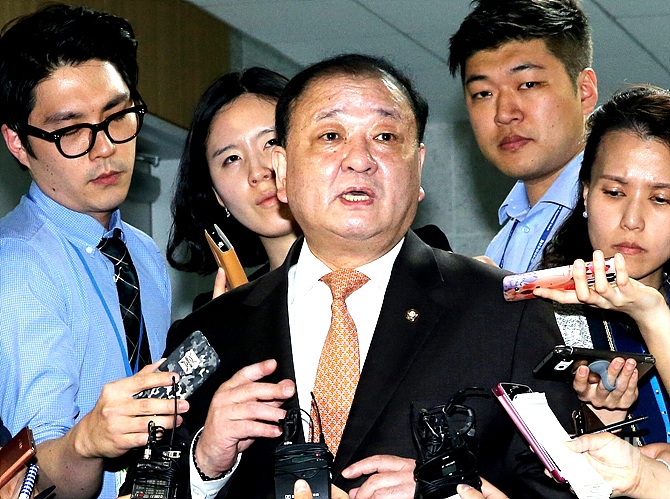 26일, 서울 여의도 국회에서 강창일 새정치민주연합 윤리심판원장이 '정청래 막말'과 관련한 징계결정 회의에 참석하기 위해 이동하는 가운데 취재진의 질문에 답변하고 있다.